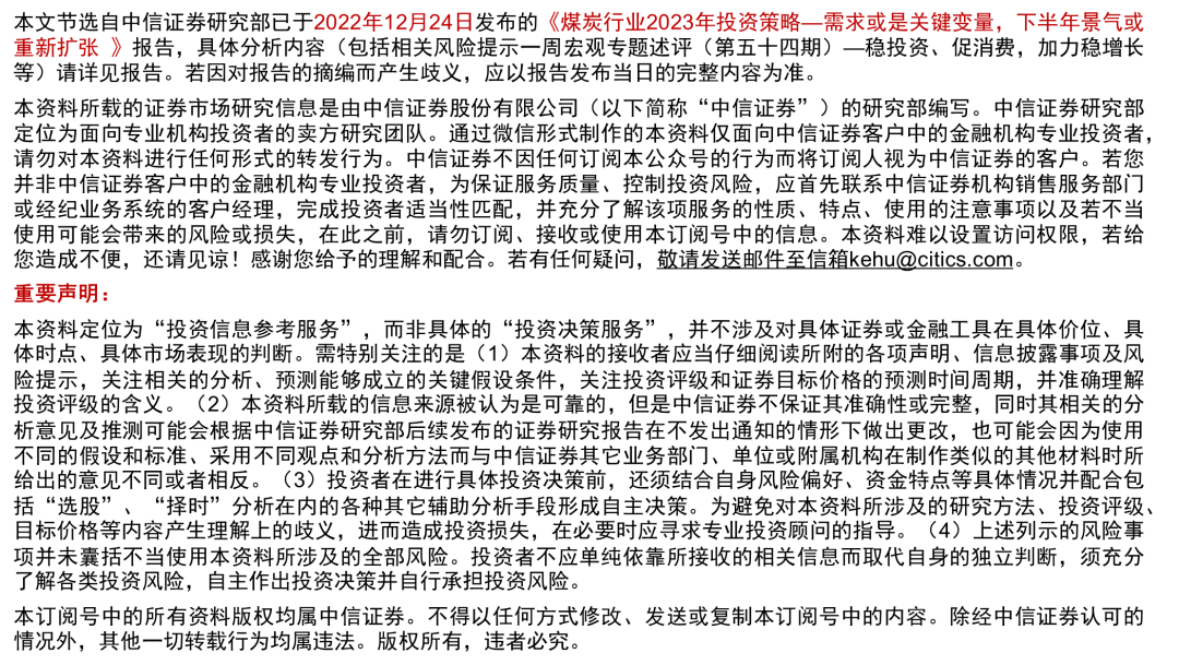 综合考虑2023年新建产能投放、产能核增以及落后产能退出,我们预计2023年原煤产量增量约为8000万吨,同比增长约2%。但海外煤价中枢或有显著回落,进口煤价格优势增强,进口量或有8%左右的增长。合计而言,我们预计2023年供给端呈现温和增长,增速约为2.5%。需求端,疫情缓和叠加稳增长政策效果的不断显现有望带动经济进一步回暖,从而带动能源消费及煤炭消费的增长,地产产业链景气度的恢复也有望带动非电力用煤需求的改善,我们预计2023年煤炭需求增速接近3%。按照GDP增速4.5~5%的假设,预计行业供需将基本维持平衡。