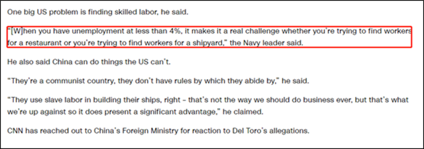 值得一提的是,德尔托罗还把美国缺乏造舰工人的原因,归结为“美国目前失业率太低”,工人不愿意去造军舰。