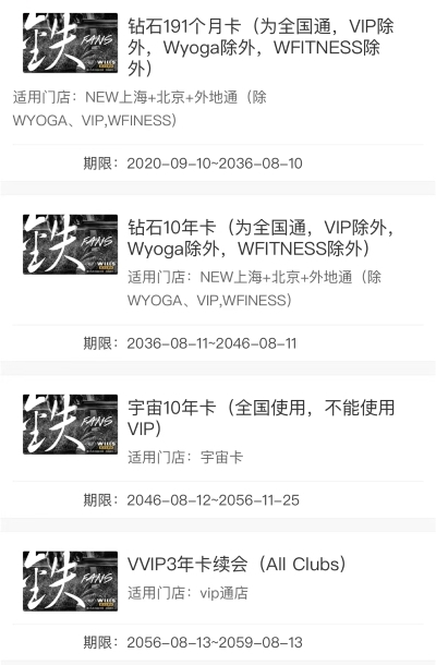 在威尔仕健身多位销售人员“立体式”洗脑推销下,此后两年,junick分别在威尔仕健身上海的四家门店、先后办理了5年期、10年期、VVIP3年期等8张不同效期的会员卡,累加起来可以使用几十年,而截至目前,未有一张会籍卡能顺利转出变现。