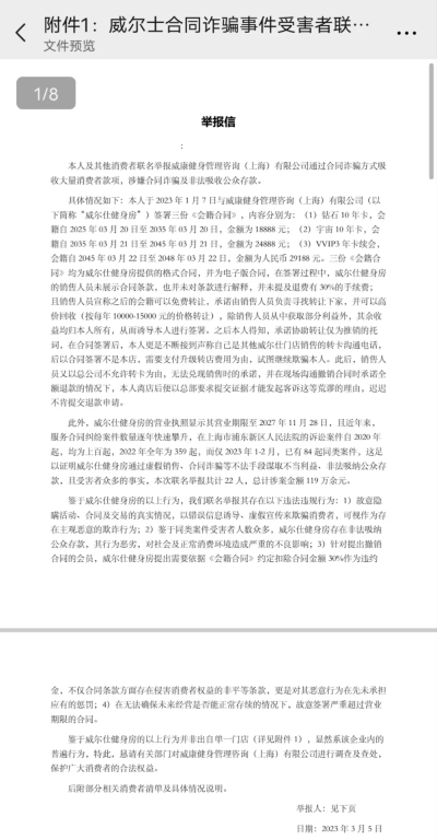 据统计,上述《举报信》中的21位消费者遍及威尔仕健身在上海各区的10多家门店,涉及金额已达百万元之巨,“本人及其他消费者联名举报威康健身管理咨询(上海)有限公司(威尔仕健身运营主体公司)通过合同诈骗方式吸收大量消费者款项,涉嫌合同诈骗及非法吸收公众存款。”上述消费者表示。