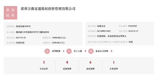 中基协官网信息显示,万鼎富通为私募股权、创业投资基金管理人,成立于2017年7月,于2018年3月完成登记,注册资本1亿元,实缴资本2500万元。目前,万鼎富通管理规模超过100亿元,备案的产品数量为10只,其中7只已清算,3只产品因未按时披露年报、半年报而显示信息报送异常。