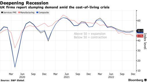 标普的数据表明,英国的GDP继第三季度收缩0.2%之后,第四季度继续收缩了0.3%。这种情况表明英国陷入了“技术性衰退”。